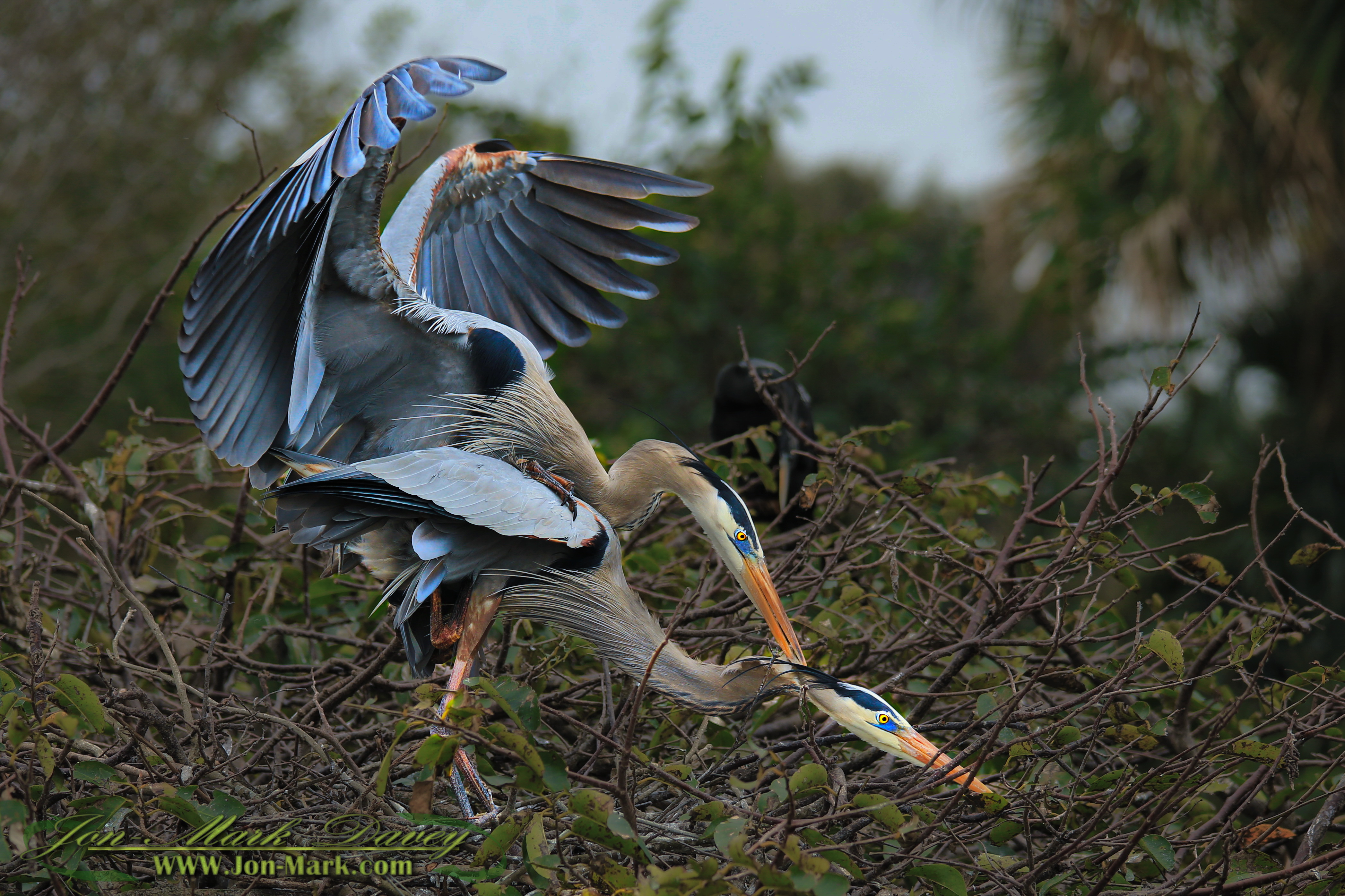 During mating season Blue Herons sometime show great public affection when they get back together after hunting for sticks for building or for food.
