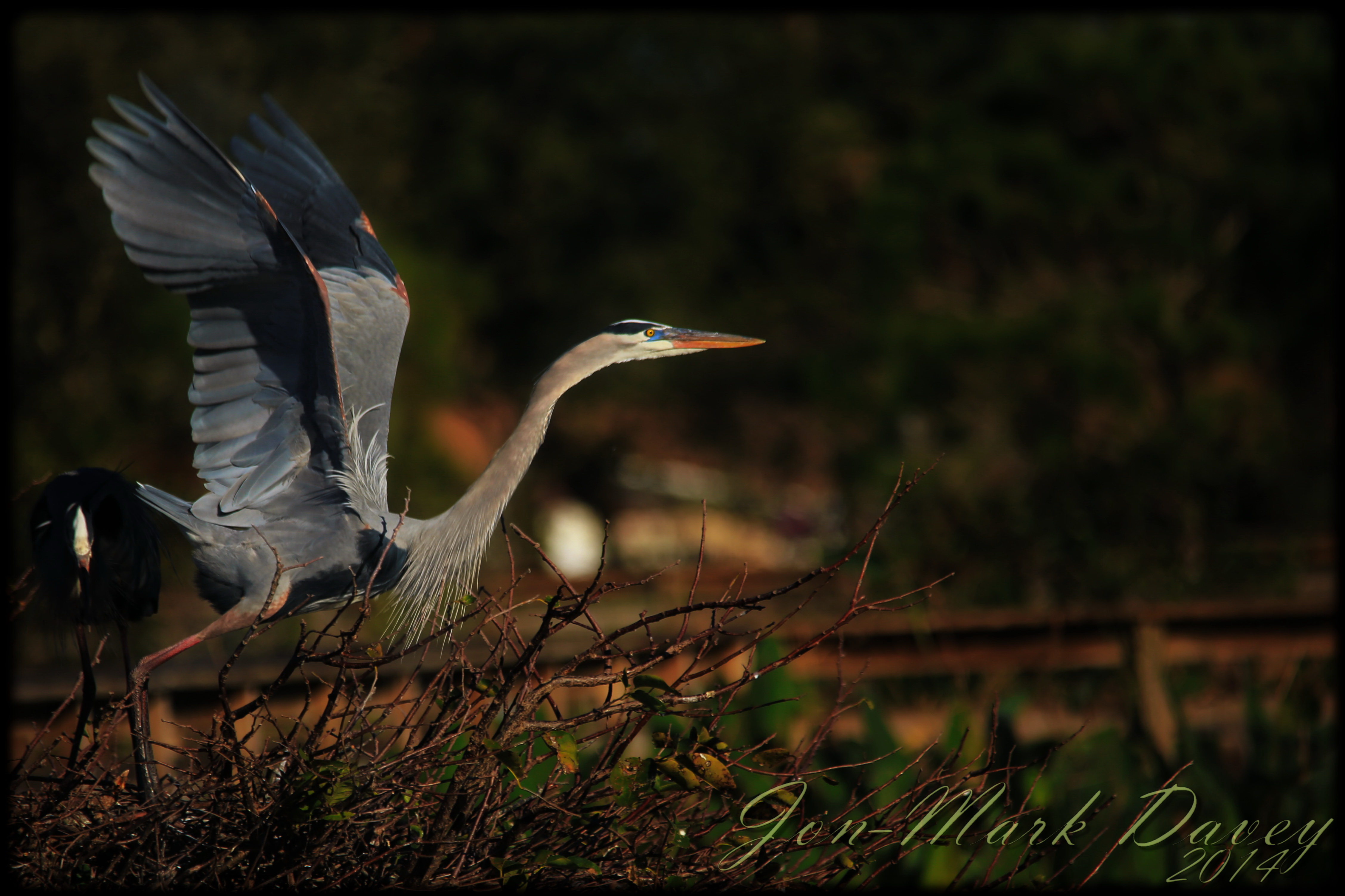 This first shot shows this male GBH just launching from the hammock where his nest sits on top of the tree clusters.