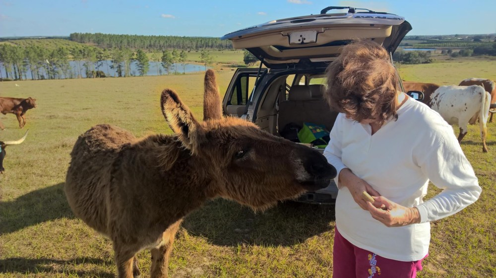 One of the things Jo likes to do when visiting Liz is to go out in the field and treat Mugsy to some carrots and pellets. Recently Mugsy was seen running off a black bear from near the cattle and calves. He’s a good mule and takes good care of his flock. Just a week before we invaded Mugsy’s field a local sheriff saw Mugsy running a black bear out of the field and away from his charge.