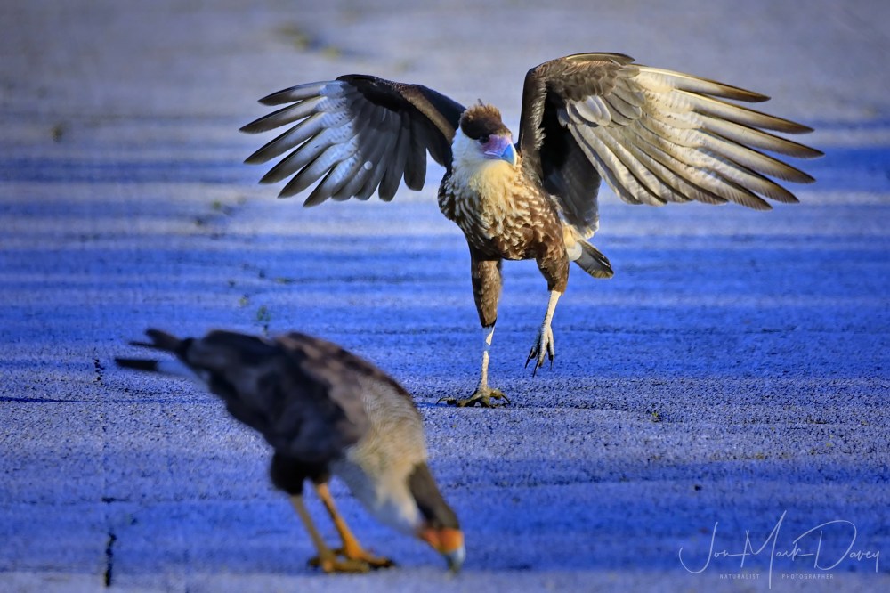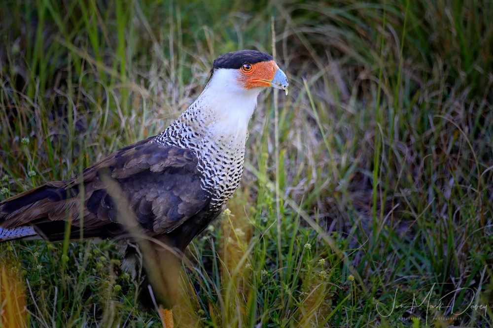These are striking birds in the falcon family, they are almost as large as a Bald Eagle. We often see Eagles, Caras, and Vultures eating from the same road kill or field carcass and the size is similar. I’ve seen them flying with Bald Eagles and their wingspan is slightly smaller but less than I imagined. If you would like more information about the Crested Caracara click this All about birds link.
