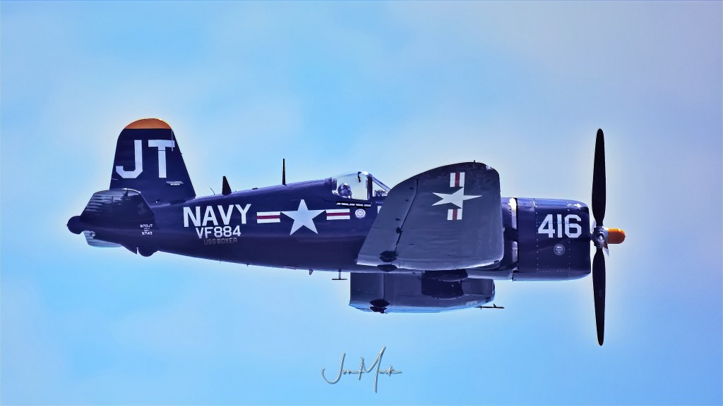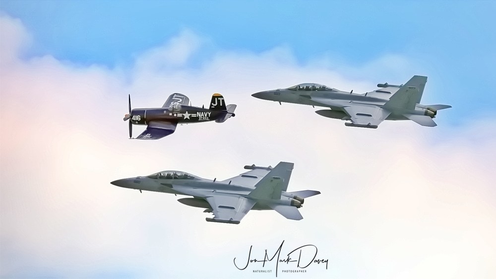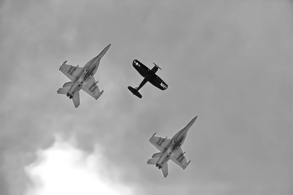 Following the F-18 routines an F4U-4 Corsair met up with the 2 supersonic F-18 Growlers to make a few “Navy Legacy Flight Foundation” laps around the sky together. The Legacy program matches today’s front line aircraft like the F-18 Growler with the Corsair in close flight maneuvers at air shows nationwide to keep the memory of time-honored sacrifice and service of those who have flown in defense of our nation. These images, like the one I captured below leaves a lasting impression on memories of our Naval pilots.