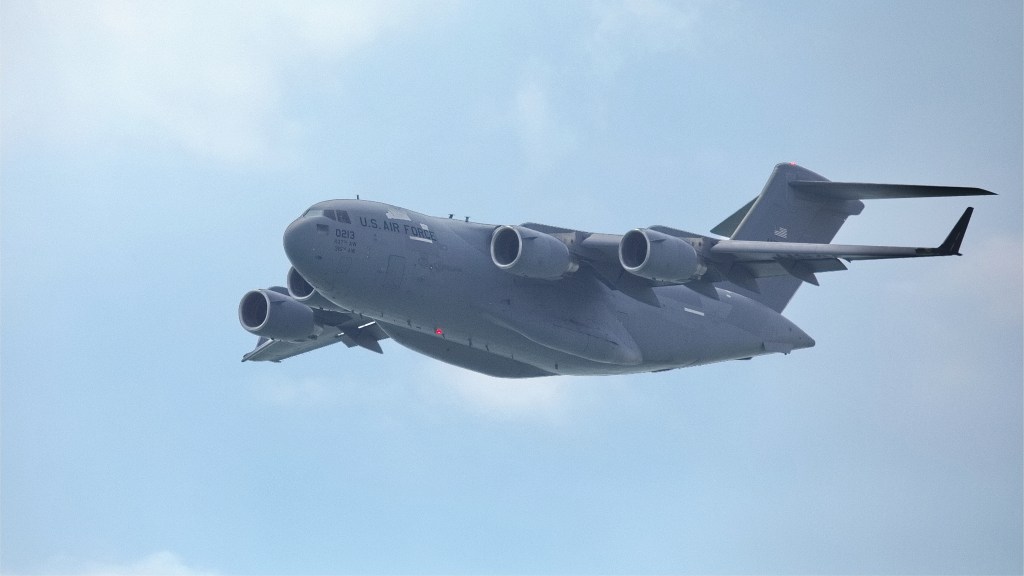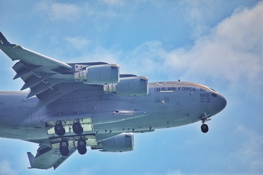 A massive Globemaster C-17 made a flyby. It was so big it blocked out the sun. This giant cargo and troop carrier is like a carrier in the sky, it’s huge and capable of global flight. It was designed to replace the C-130.