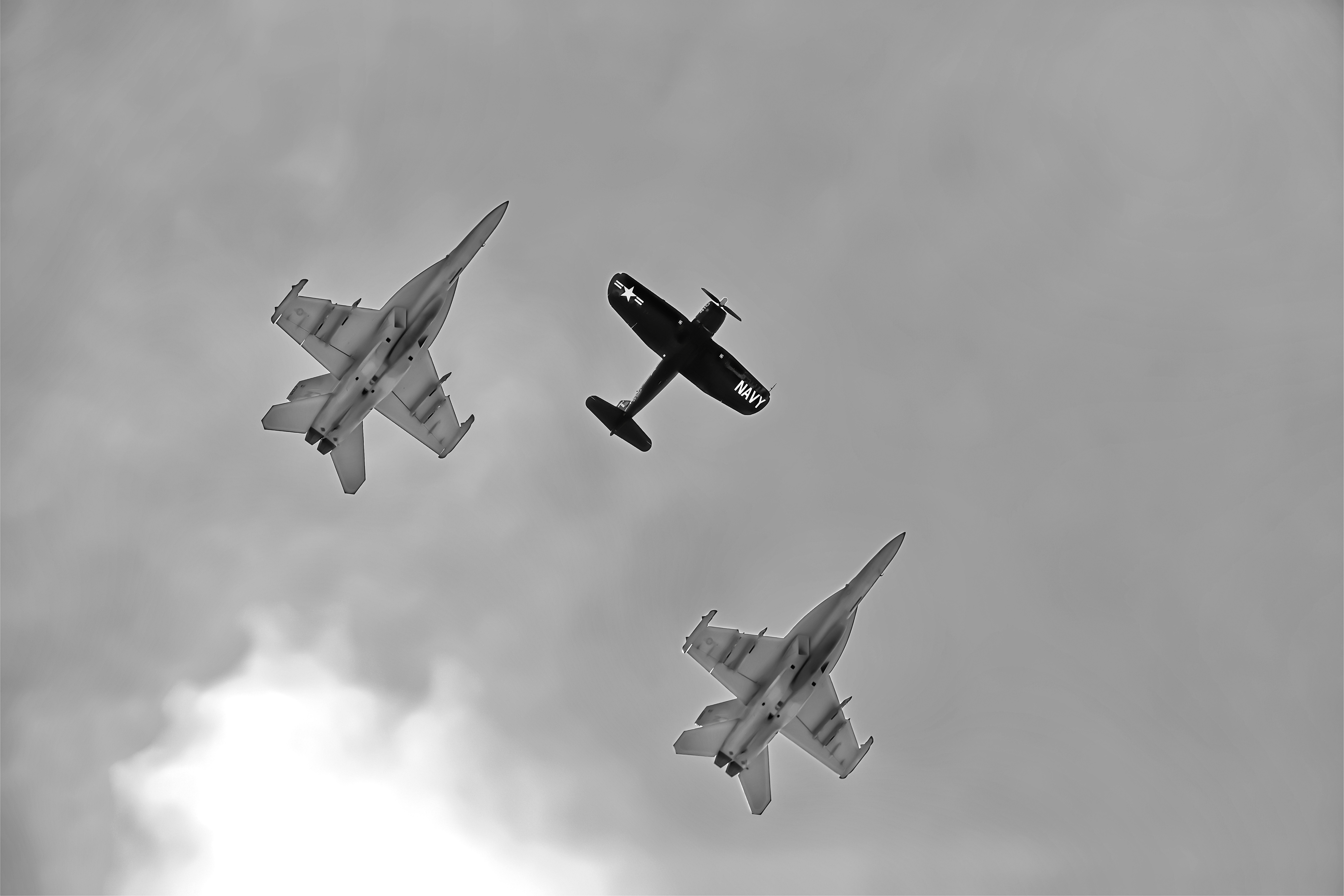 Following the F-18 routines an F4U-4 Corsair met up with the 2 supersonic F-18 Growlers to make a few “Navy Legacy Flight Foundation” laps around the sky together. The Legacy program matches today’s front line aircraft like the F-18 Growler with the Corsair in close flight maneuvers at air shows nationwide to keep the memory of time-honored sacrifice and service of those who have flown in defense of our nation. These images, like the one I captured below leaves a lasting impression on memories of our Naval pilots.