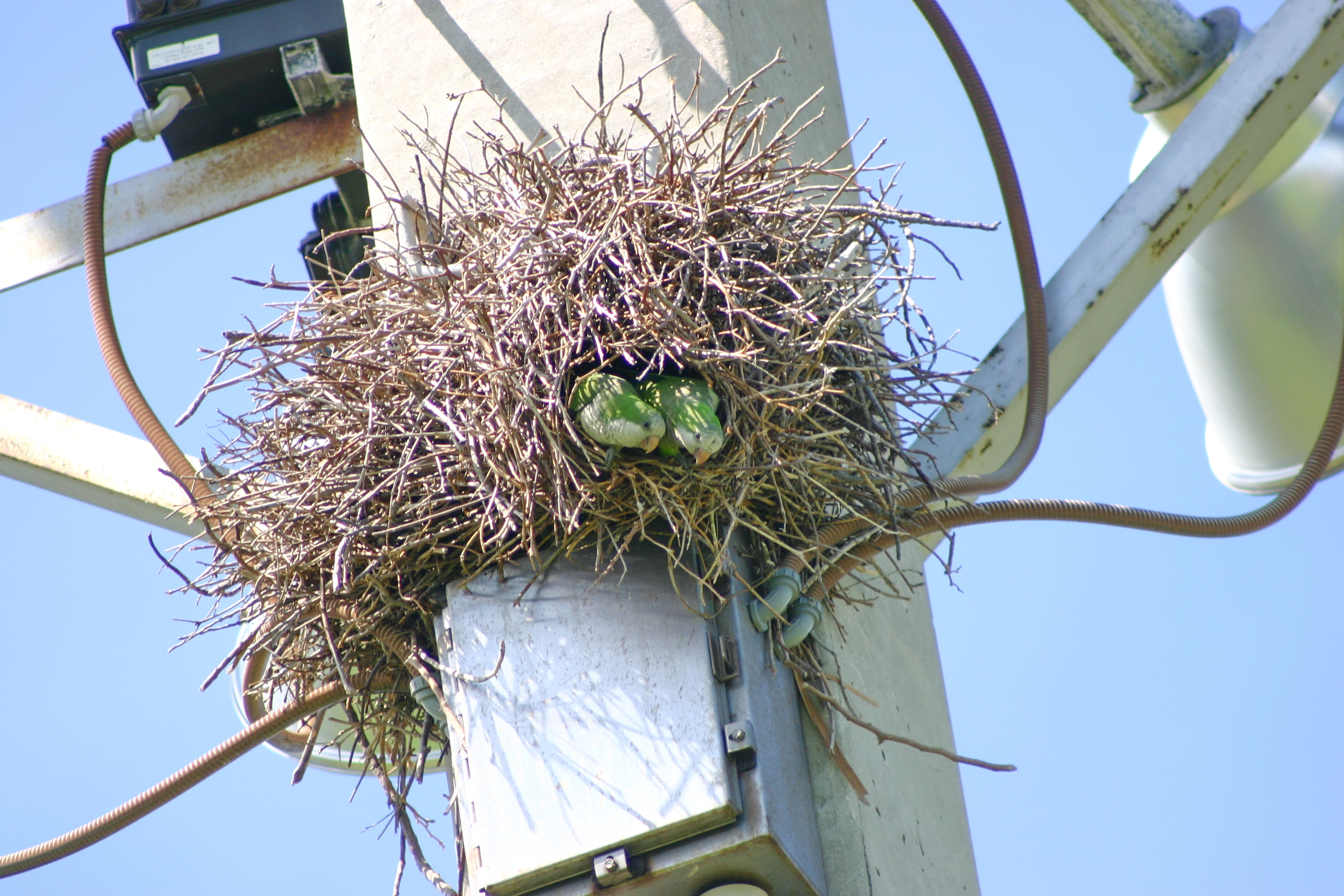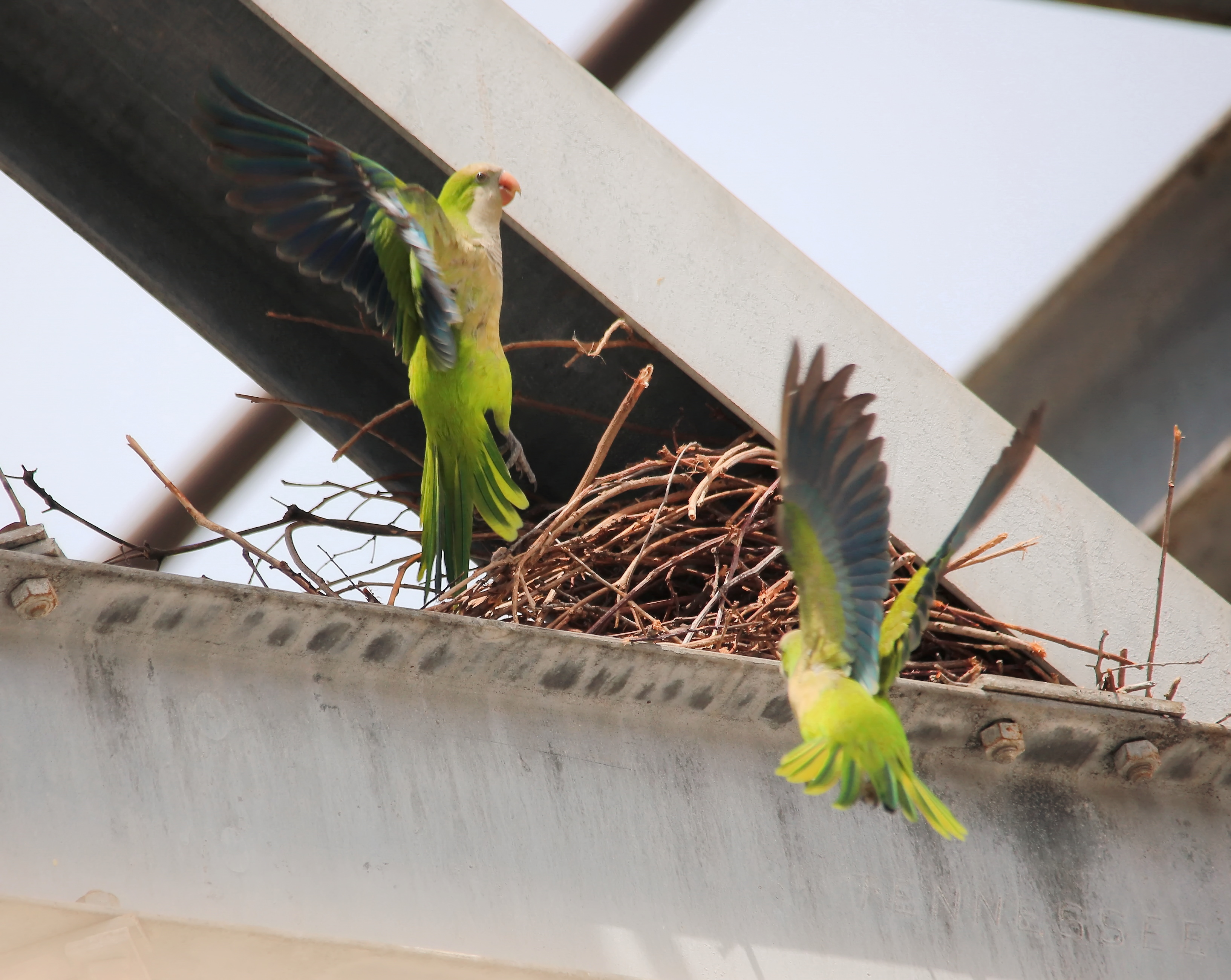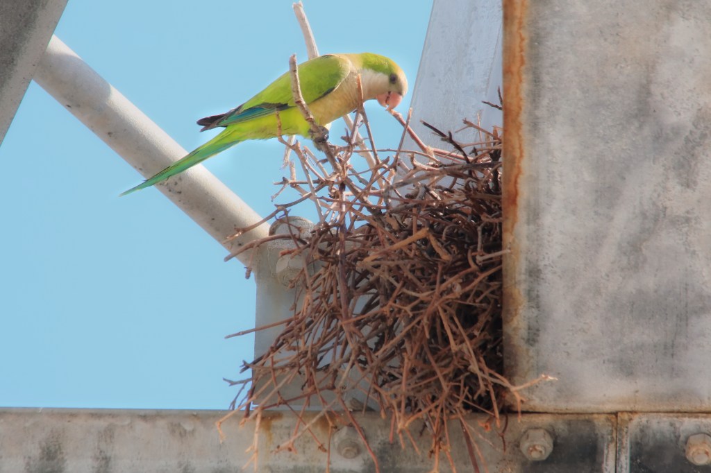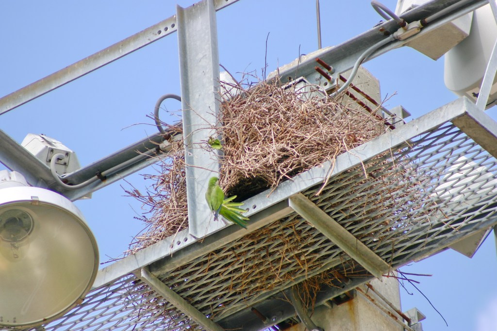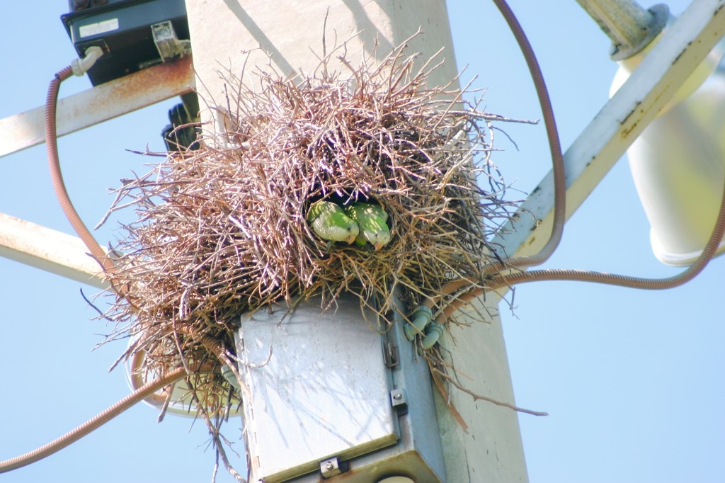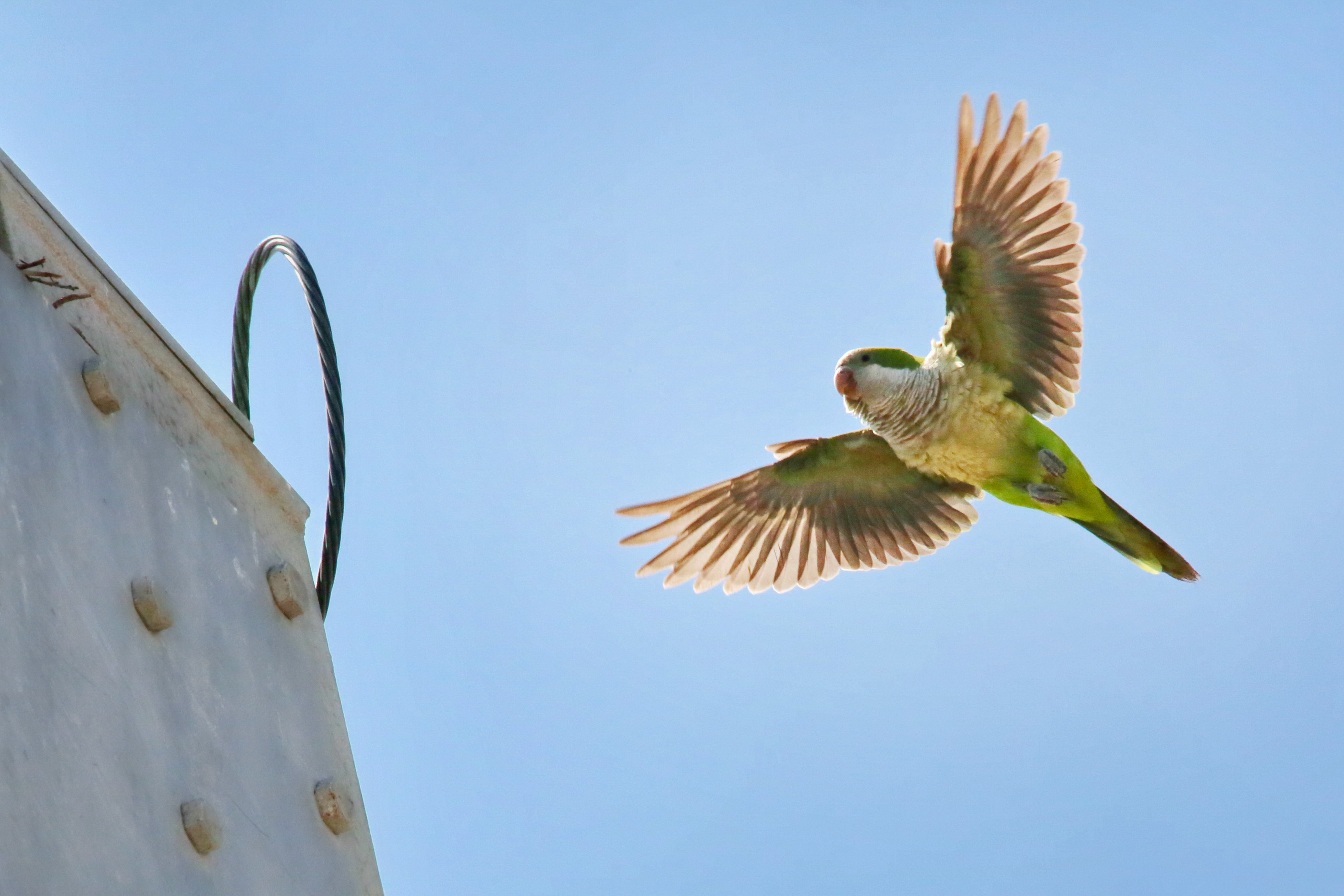 A high flying wild Quaker Parrot about to land near his nest in a power structureSoutheast Seaward Street