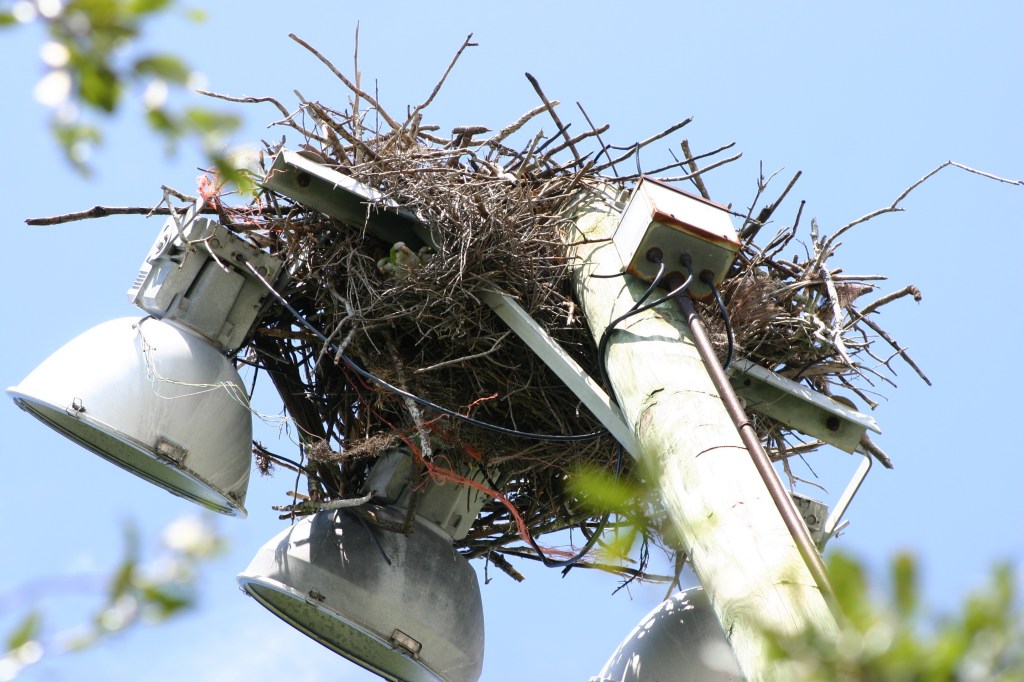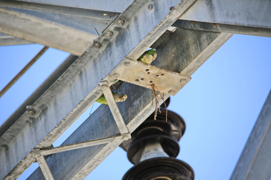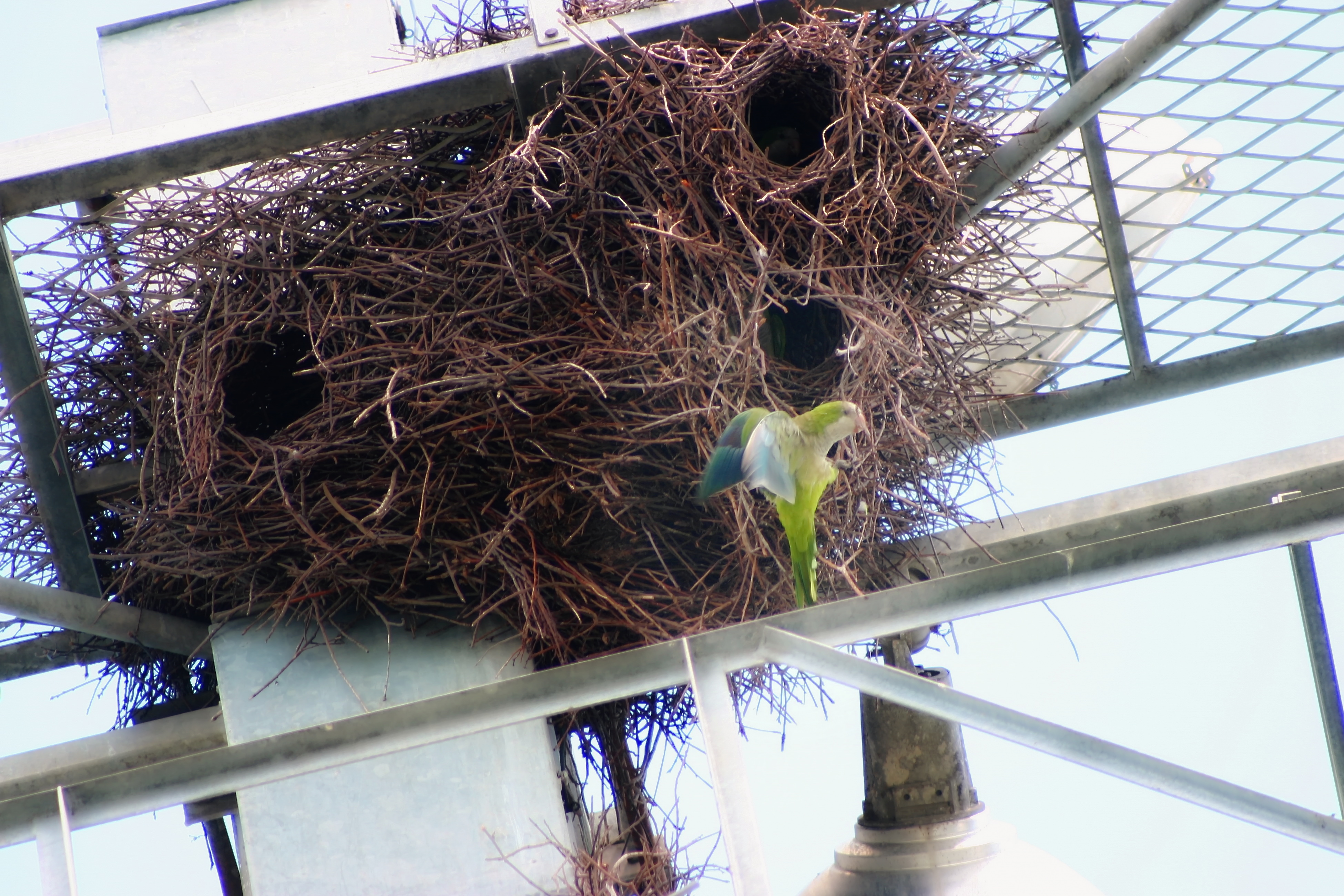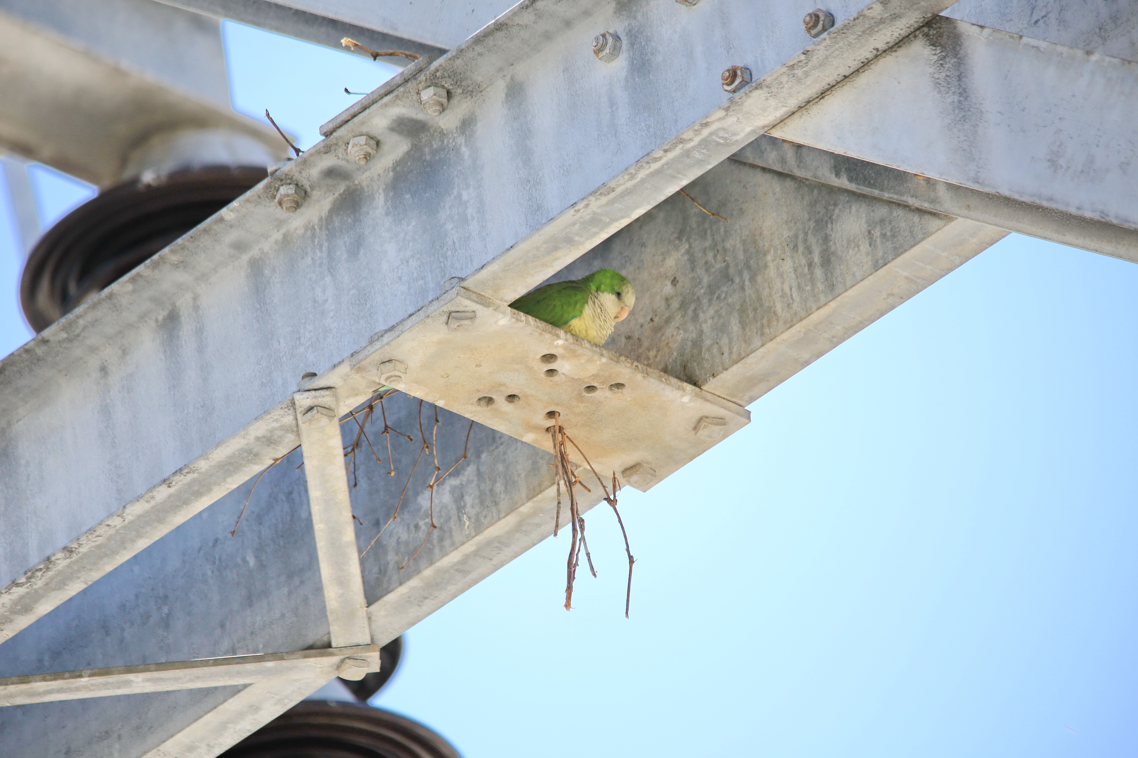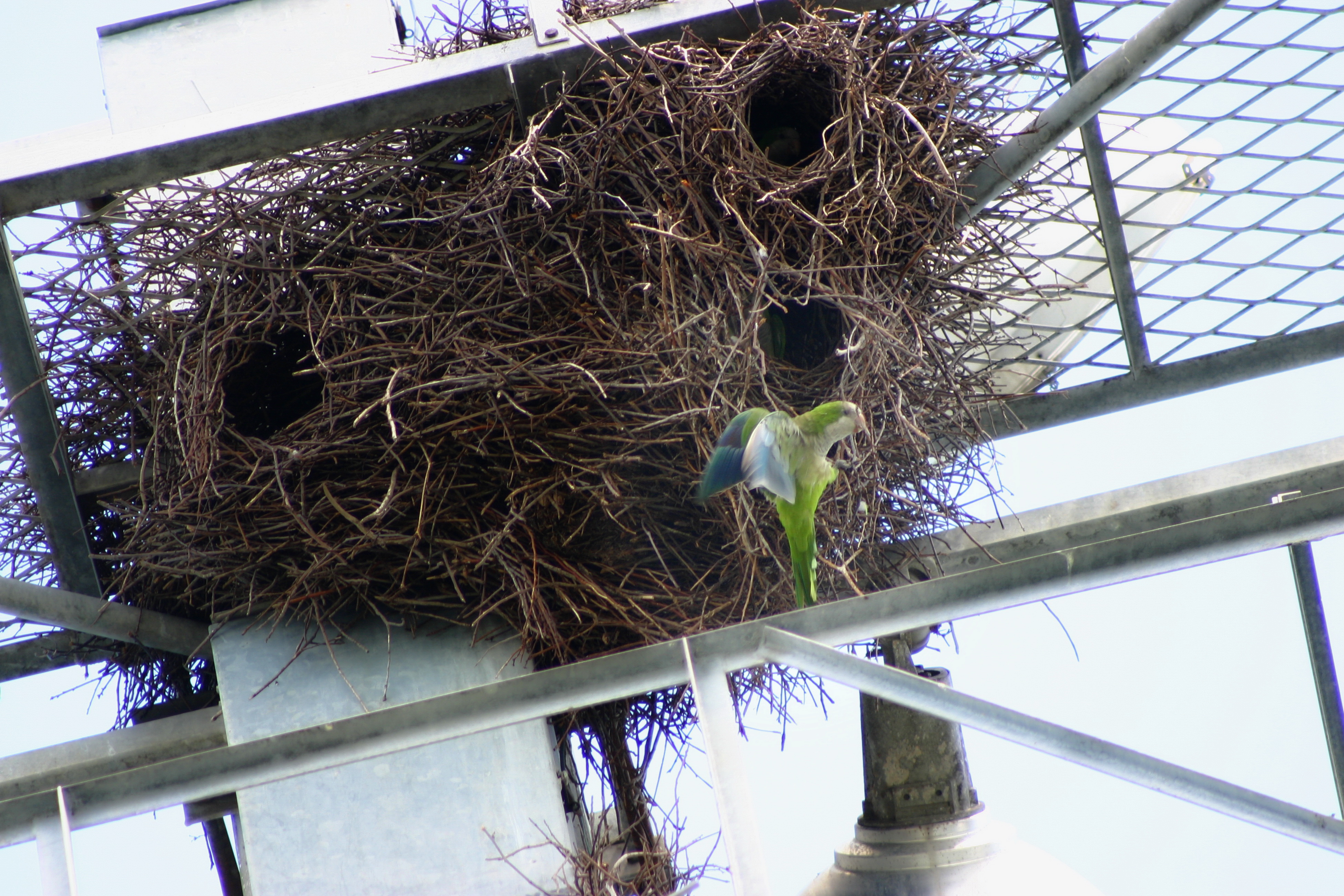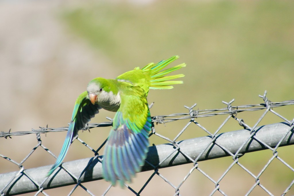 A high flying wild Quaker Parrot about to land near his nest in a power structureSoutheast Seaward Street