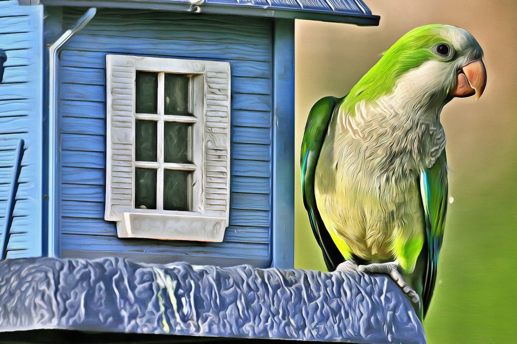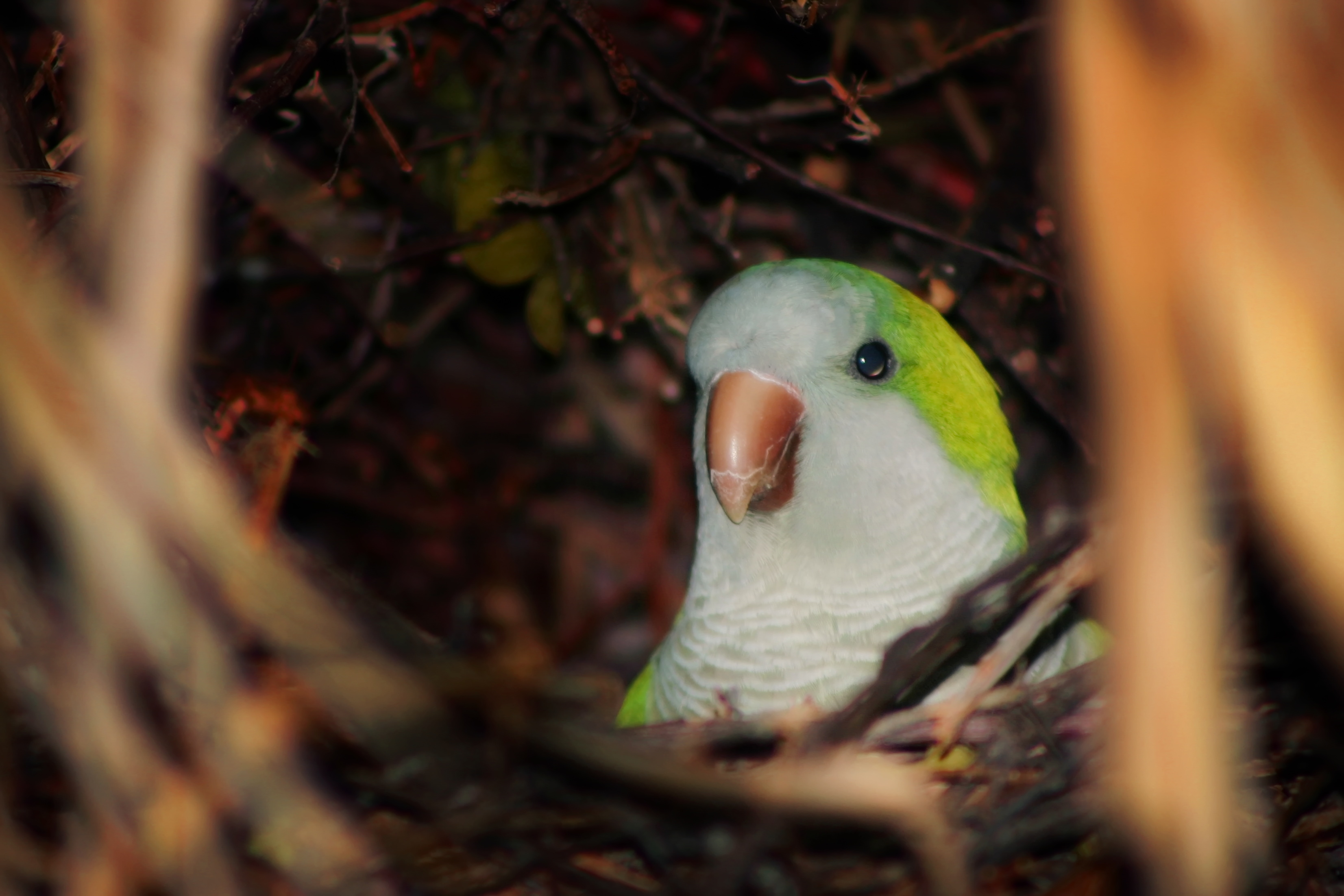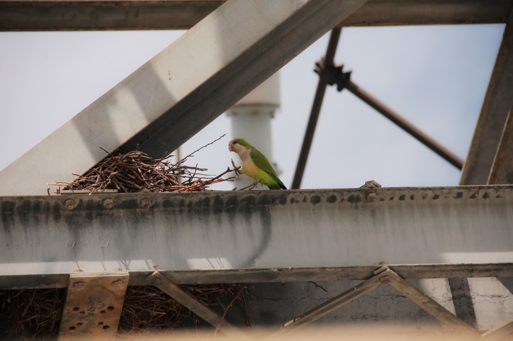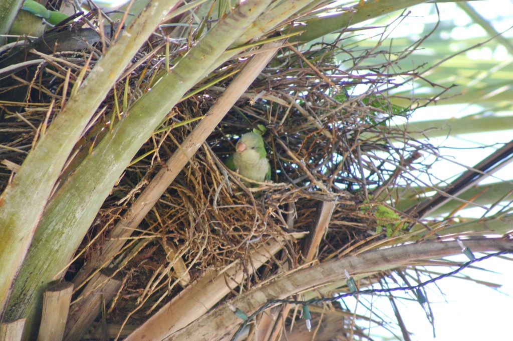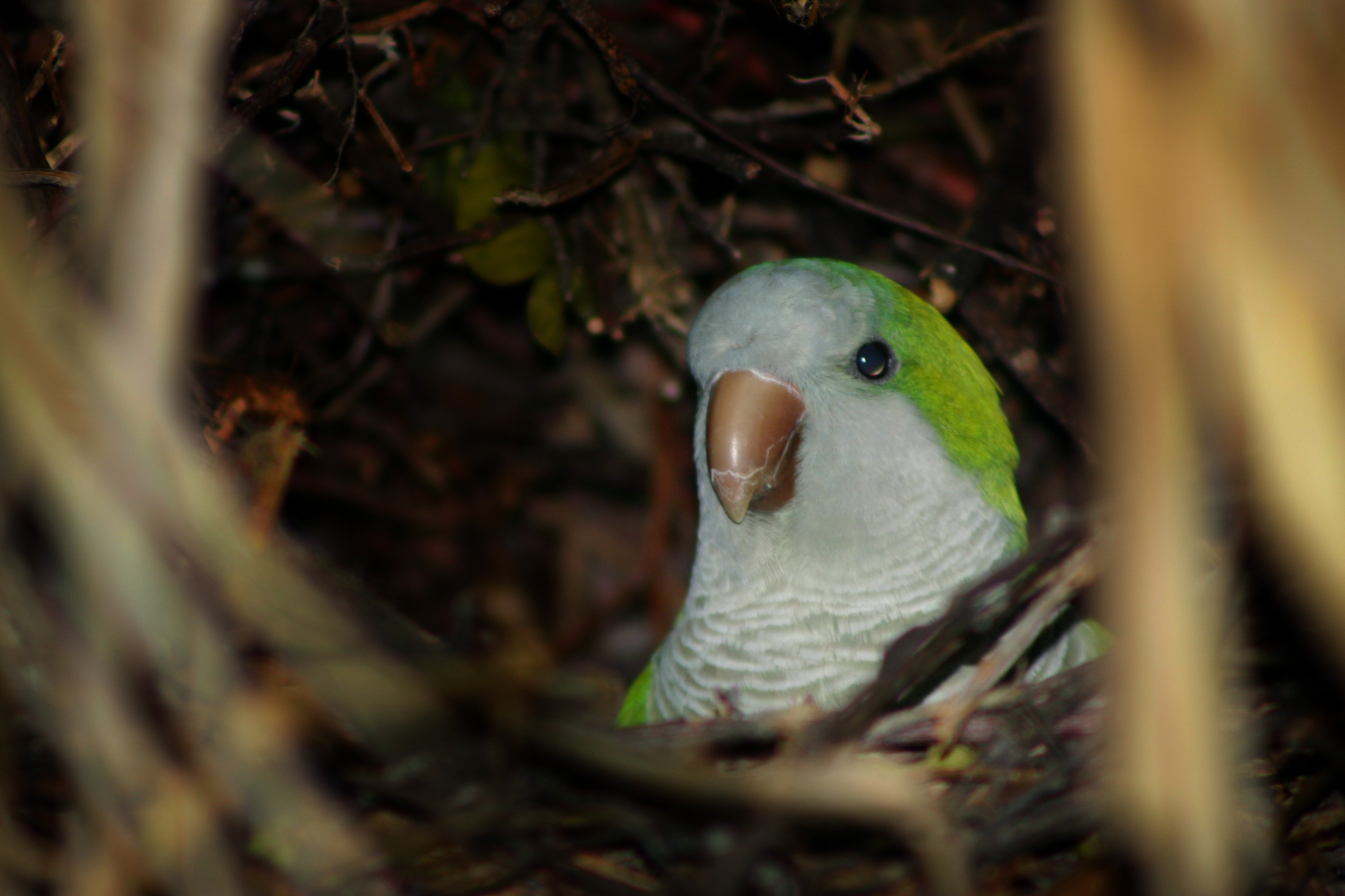 Lens Info:A wild Quaker Parrot fixing to work on the house.Southeast Desoto Avenue